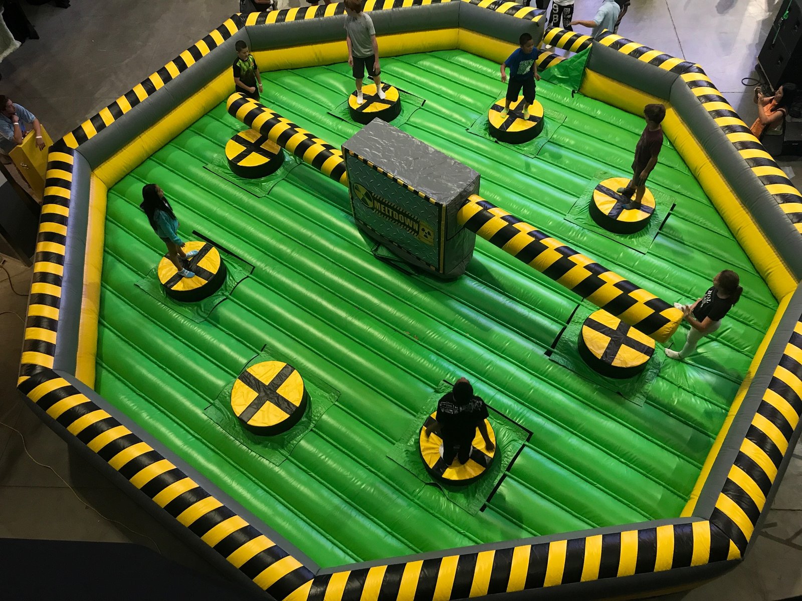 The vivid toxic meltdown color scheme, featuring bright green contrasted with black, gray, and yellow, makes this attraction a powerful visual centerpiece for any event. With adjustable speed controls, the challenge level can be customized to suit different age groups and event styles.