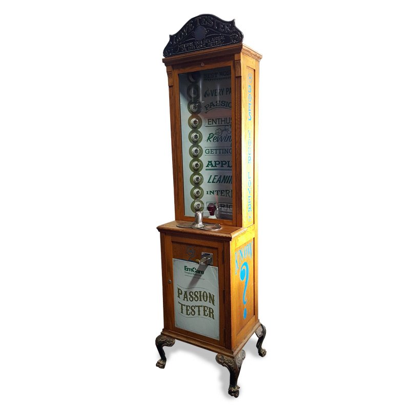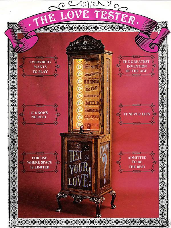 For over 80 years, the Love Tester has entertained players of all ages. Participants squeeze the handle to start the game, and a light randomly stops on one of ten love level descriptions, revealing their “love score.”
