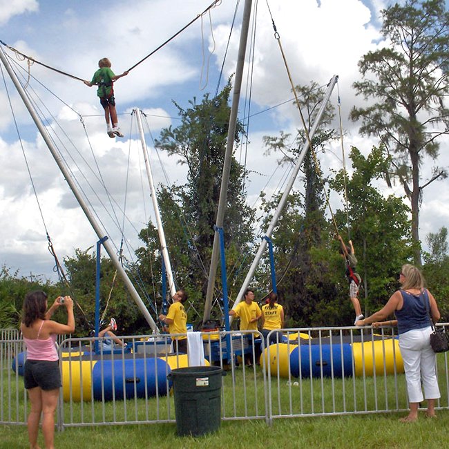 Designed to accommodate up to four riders at the same time, the 4-in-One Bungee Trampoline gives participants the opportunity to soar as high as 20 feet in the air, making front flips and back flips while staying centered over the trampoline. The elastic support system enhances stability and control, creating a thrilling yet well balanced experience.