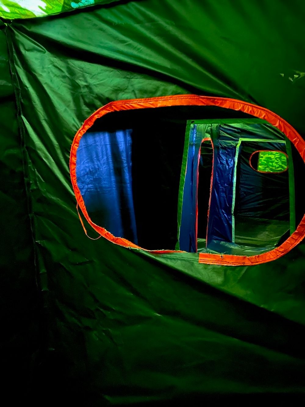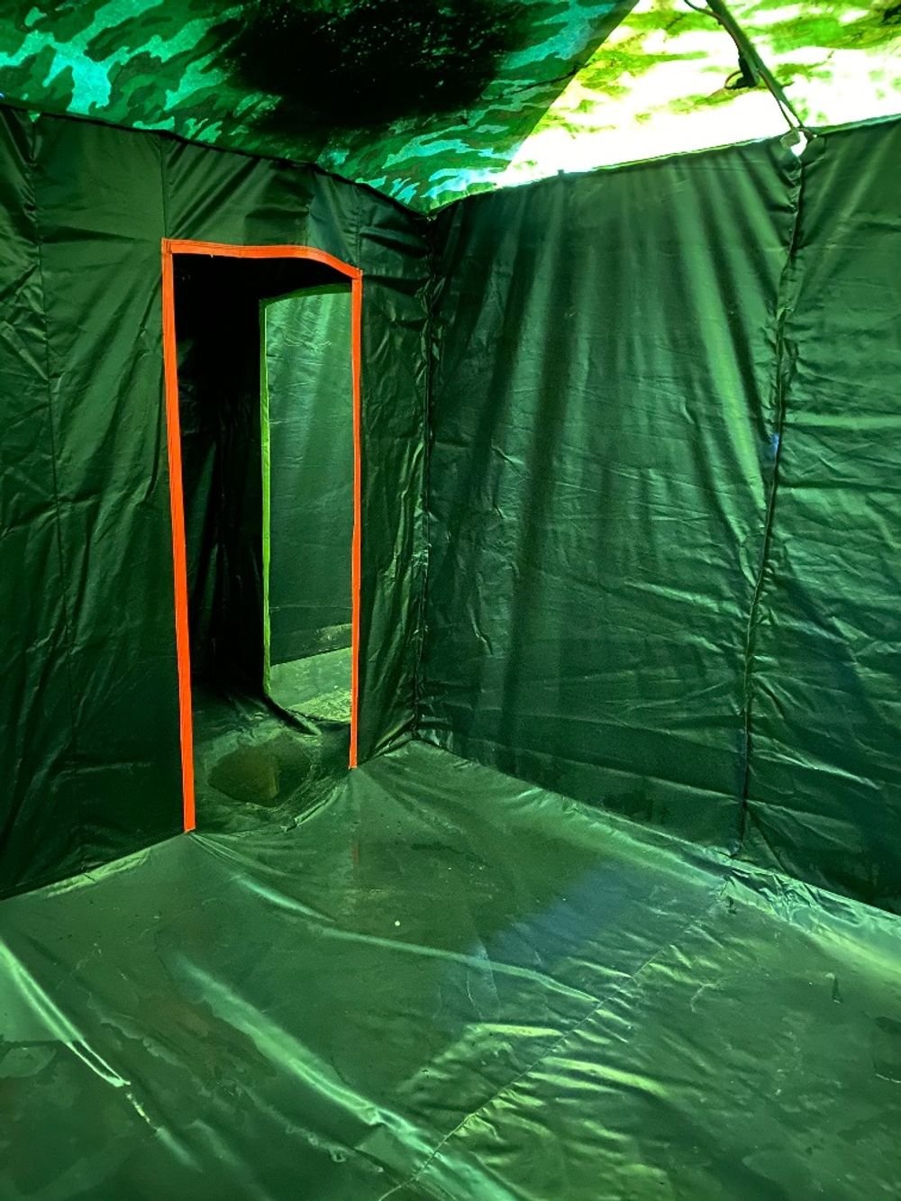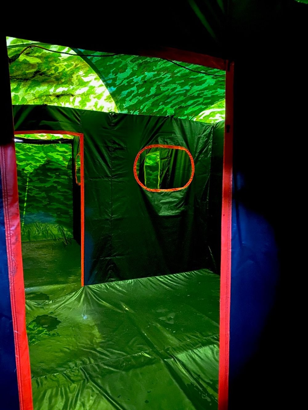 Designed as a fully enclosed inflatable arena, this unit features four entry points, a large central room, and several smaller rooms to create dynamic gameplay and strategic movement. Reflective vinyl tape outlines interior doors and windows for enhanced visibility, while built-in black lights elevate the space-age atmosphere.