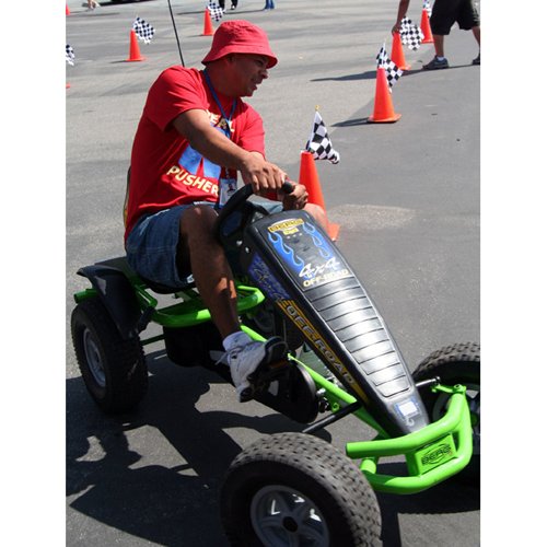 Our racing pedal carts are designed for durability, comfort, and performance. Each cart features a six-position adjustable seat, air-filled tires with heavy-duty inner tubes, sealed ball bearings, a heavy-wall steel frame with powder-coated finish, smooth steering with ball bearings, a transmission with coaster brake and reverse, plus both parking and hand brakes. With a 350 lb weight limit, these full-size, four-wheel pedal carts are suitable for ages 7 through adult.